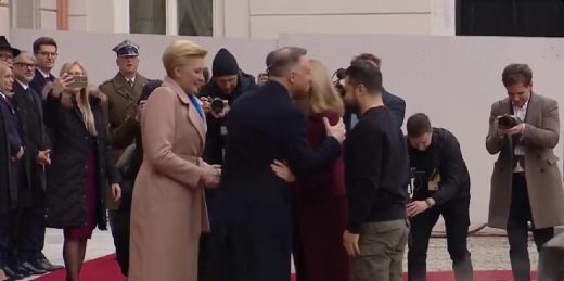 Президент Польщі Анджей Дуда і перша леді Агата зустріли Володимира та Олену Зеленських у Королівському замку у Варшаві.