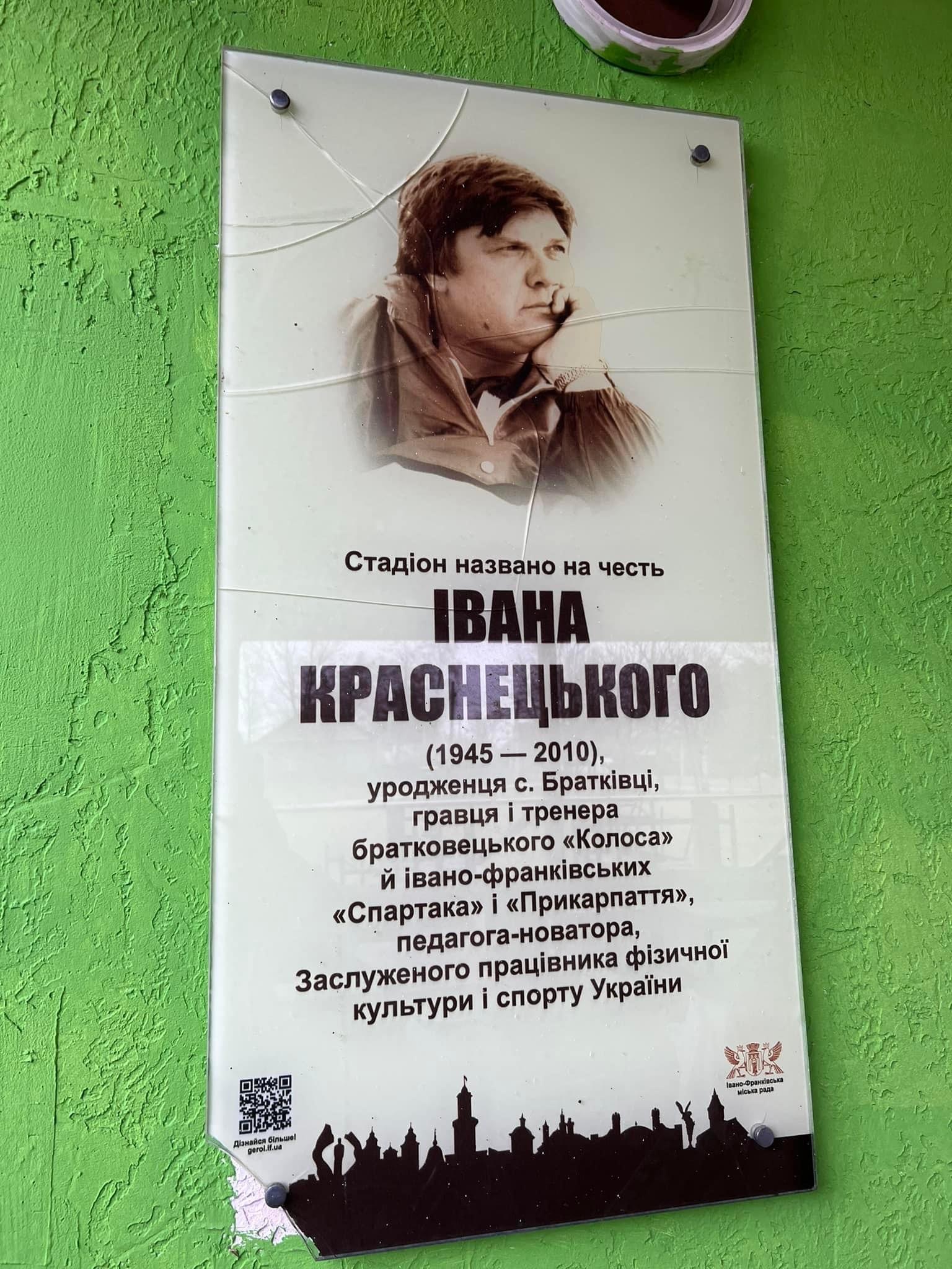 На стадіоні в селі Братківці сьогодні замінили меморіальну дошку Заслуженому працівнику фізичної культури і спорту, тренеру Івану Краснецькому.