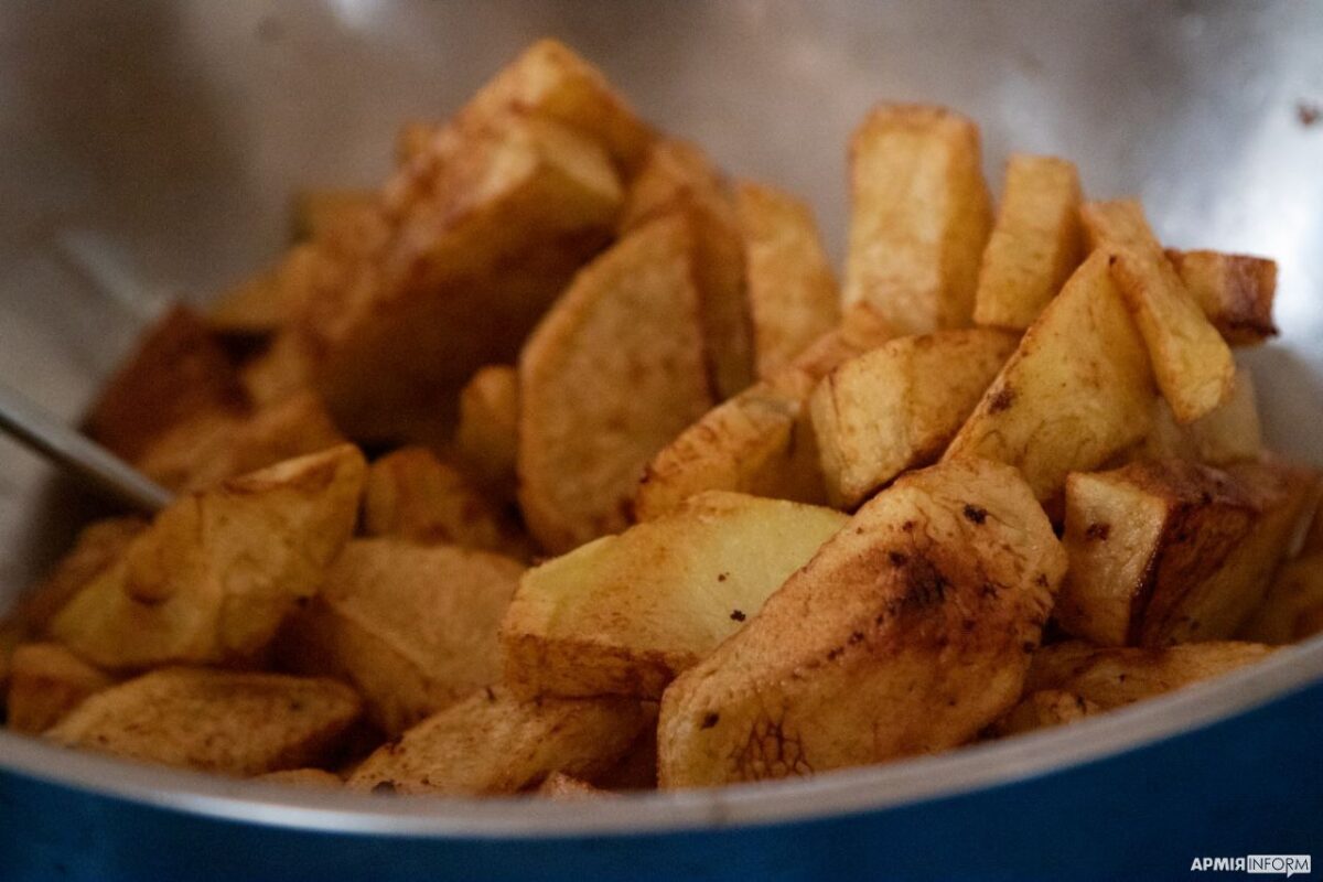 “Із перших страв у нас борщ, капусняк, бульйони курячі та грибні, суп гороховий. Смажимо котлети, відбивні, рибу. Щоразу намагаємось робити різні салати: і олів’є, і дністер тощо. У неділю традиційно готуємо чанахи по-гуцульськи зі свинячими реберцями, квасолею, картоплею та морквою. Скажу чесно, ще жодна людина від нас не вийшла незадоволеною чи голодною”, – ділиться воїн.