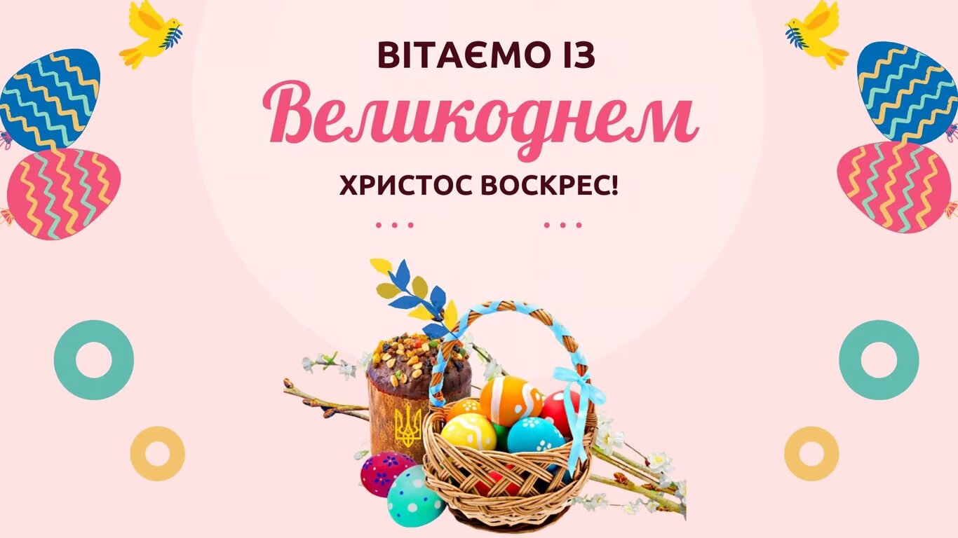 Вітаємо Вас зі світлим святом Христового Воскресіння, нехай передзвін великодніх дзвонів принесе Вам лише благі вісті, нехай Ваше серце наповниться радістю, хай віра допомагає Вам долати труднощі