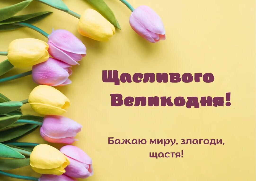 Вітаю зі світлим святом Пасхи! Нехай зійде на твій дім благодать, мир і спокій. Нехай панують у вашій родині любов і доброта, турбота один про одного. Здоров’я і щастя Вам та вашим близьким. Нехай життя буде наповнене веселощами та радістю.