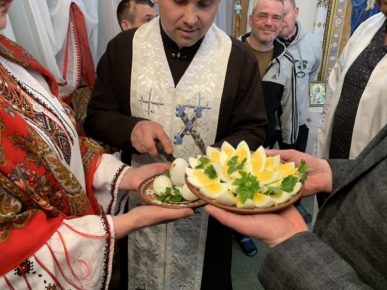 Щоб нікого не оминути, з вітаннями побували ще й в лікарняних палатах, де лікуються захисники. Всіх почастували свяченим яєчком, усім на згадку про нашу громаду і Великдень у ній залишили подарунок.