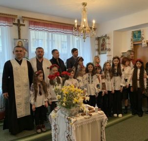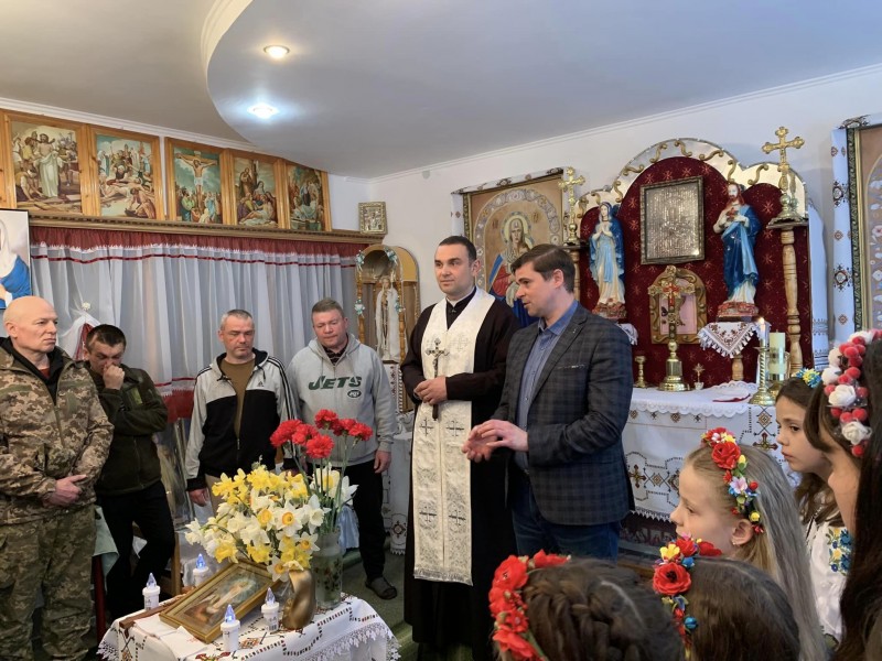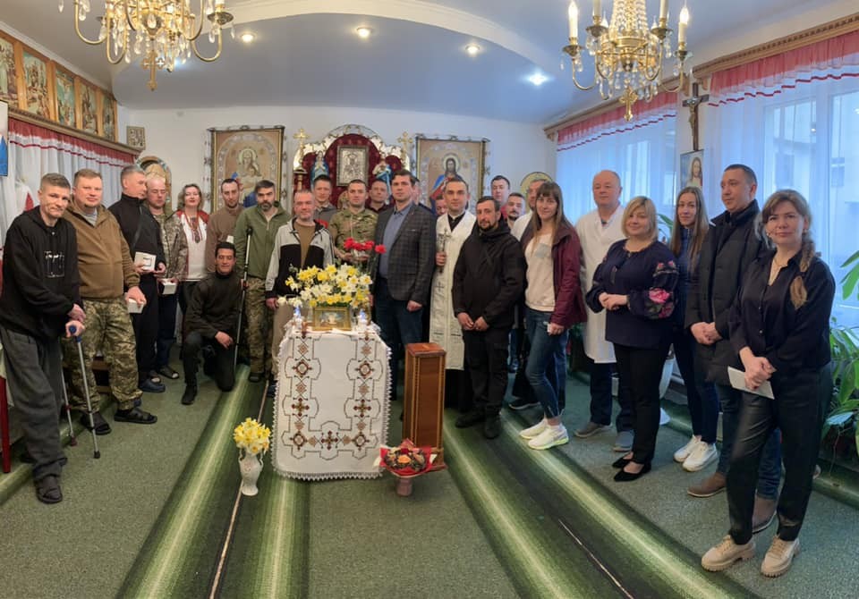 Зустріч пройшла у неймовірно теплій атмосфері. Спочатку зібрались в облаштованій лікарняній каплиці разом з тими військовими, хто зміг прийти. О. Василь Бігун – медичний капелан УГКЦ поблагословив усіх, а діти – вихованці вокальної студії п/к «Мінерал» піснею, прославляючи Христа, привітали наших військових.