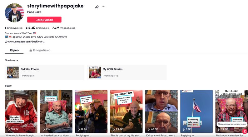 100-літній Джейк Ларсон на своїй сторінці в TikTok ділиться історіями про Другу світову війну. За його розповідями слідкують понад 615 тисяч користувачів.