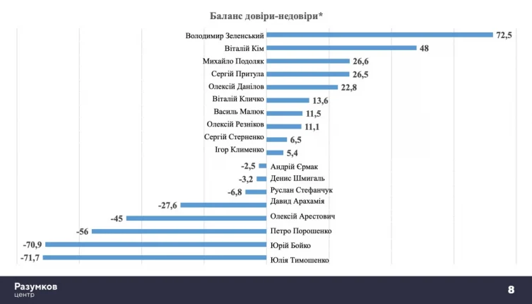 Український центр економічних та політичних досліджень ім. О. Разумкова опублікував результати свого соціологічного опитування щодо того, як українські громадяни оцінюють ситуацію в країні та яким інститутам і політикам вони довіряють найбільше, а яким — найменше.