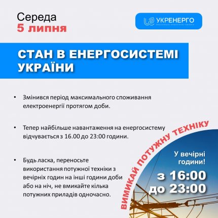 Якщо ще минулого тижня вечірній пік припадав на 19:00 – 22:00, то з понеділка навантаження на енергосистему відчувається з 16.00 до 23:00 години. Щоб дати енергосистемі можливість відновитися та полегшити балансування необхідно зменшити споживання електроенергії у вечірні години доби з 16:00 до 23:00.