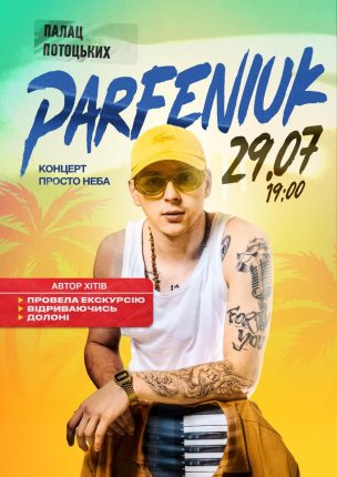 У суботу, 29 липня, о 19.00 у парку палацу Потоцьких пройде концерт Parfeniuk — популярного хіп-хоп співака, який завоював аудиторію з найпершого треку «Провела екскурсію».
