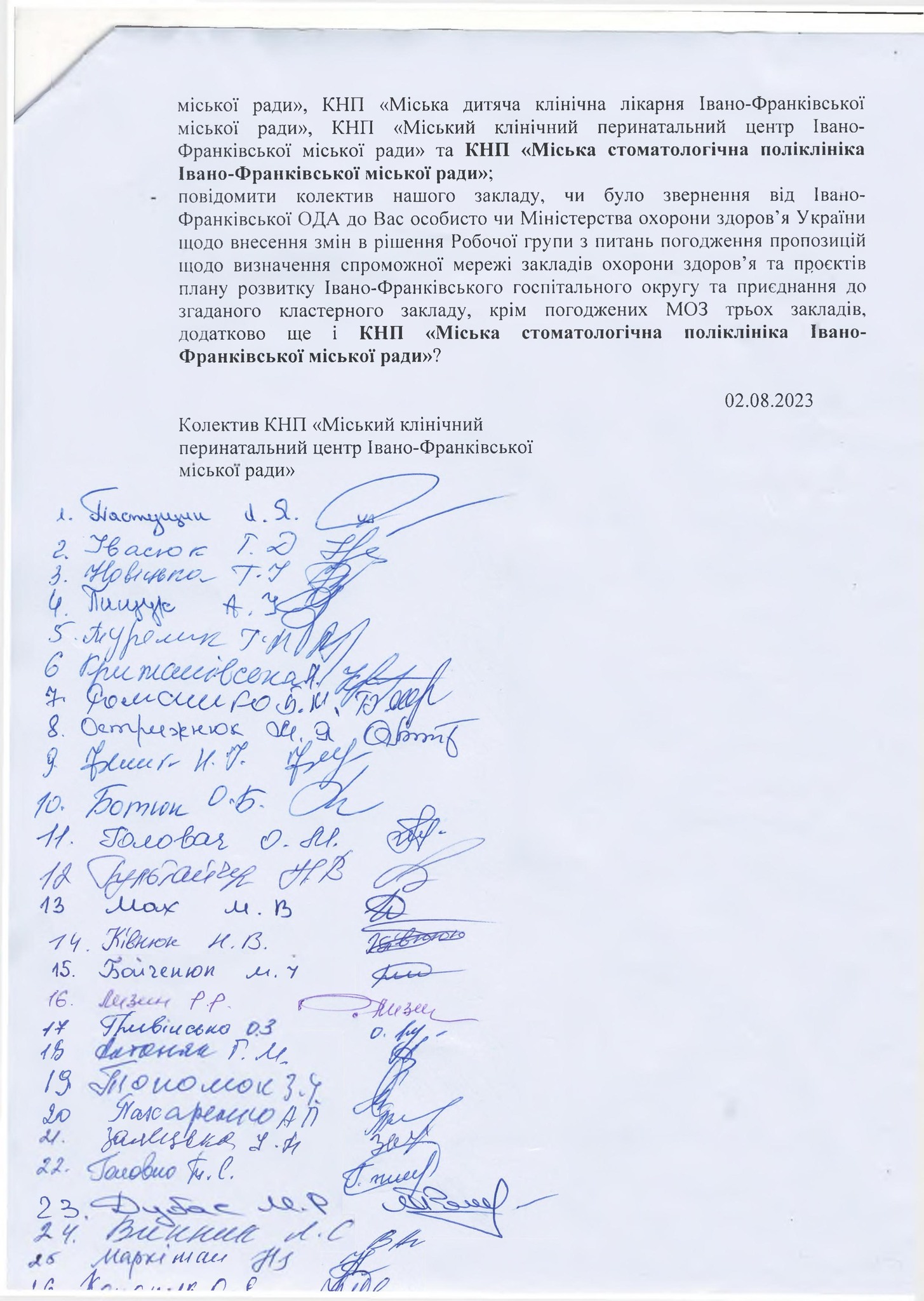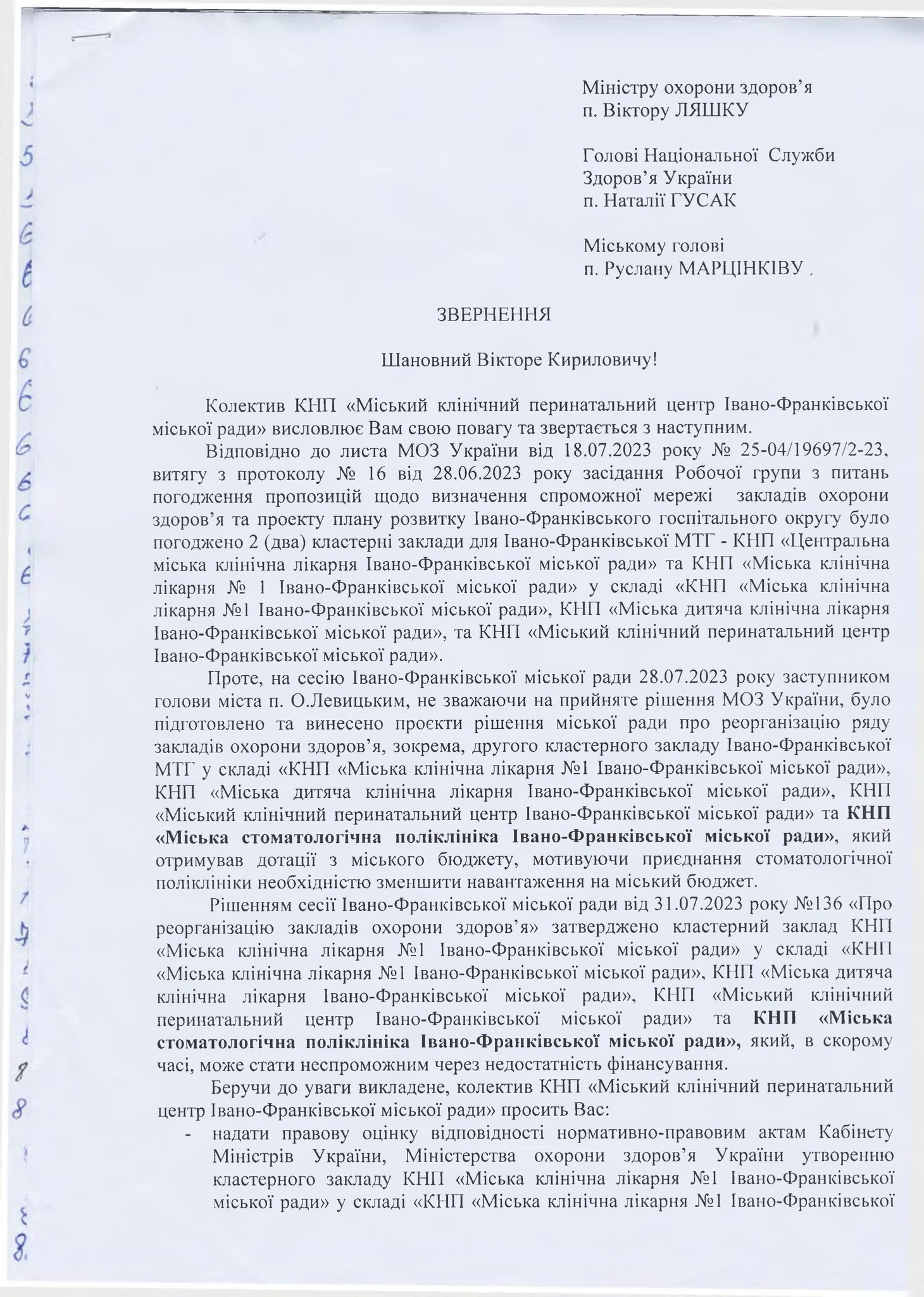 Колектив КНП “Міський клінічний перинатальний центр Івано-Франківської міської ради” написав звернення до Міністра охорони здоров’я Віктора Ляшка.