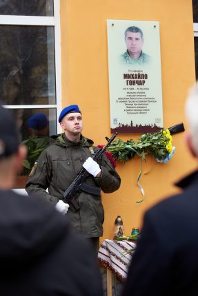 У день народження Героя на фасаді ліцею №7, де вчився Михайло Гончар, відкрили анотаційну дошку. Сюди прийшли рідні, близькі та друзі захисника.