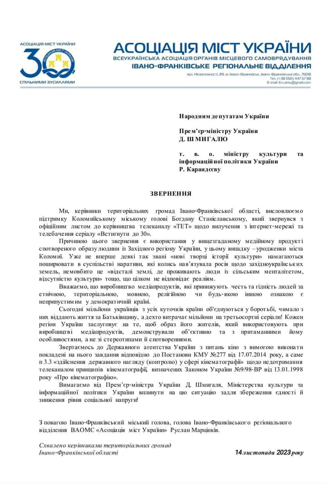 Так вони висловили підтримку міському голові Коломиї Богдану Станіславському, який звернувся з офіційним листом до керівництва телеканалу «ТЕТ» щодо вилучення з інтернет-мережі та телебачення серіалу «Встигнути до 30», повідомив директор Регіонального відділення Асоціації міст України Юрій Стефанчук.