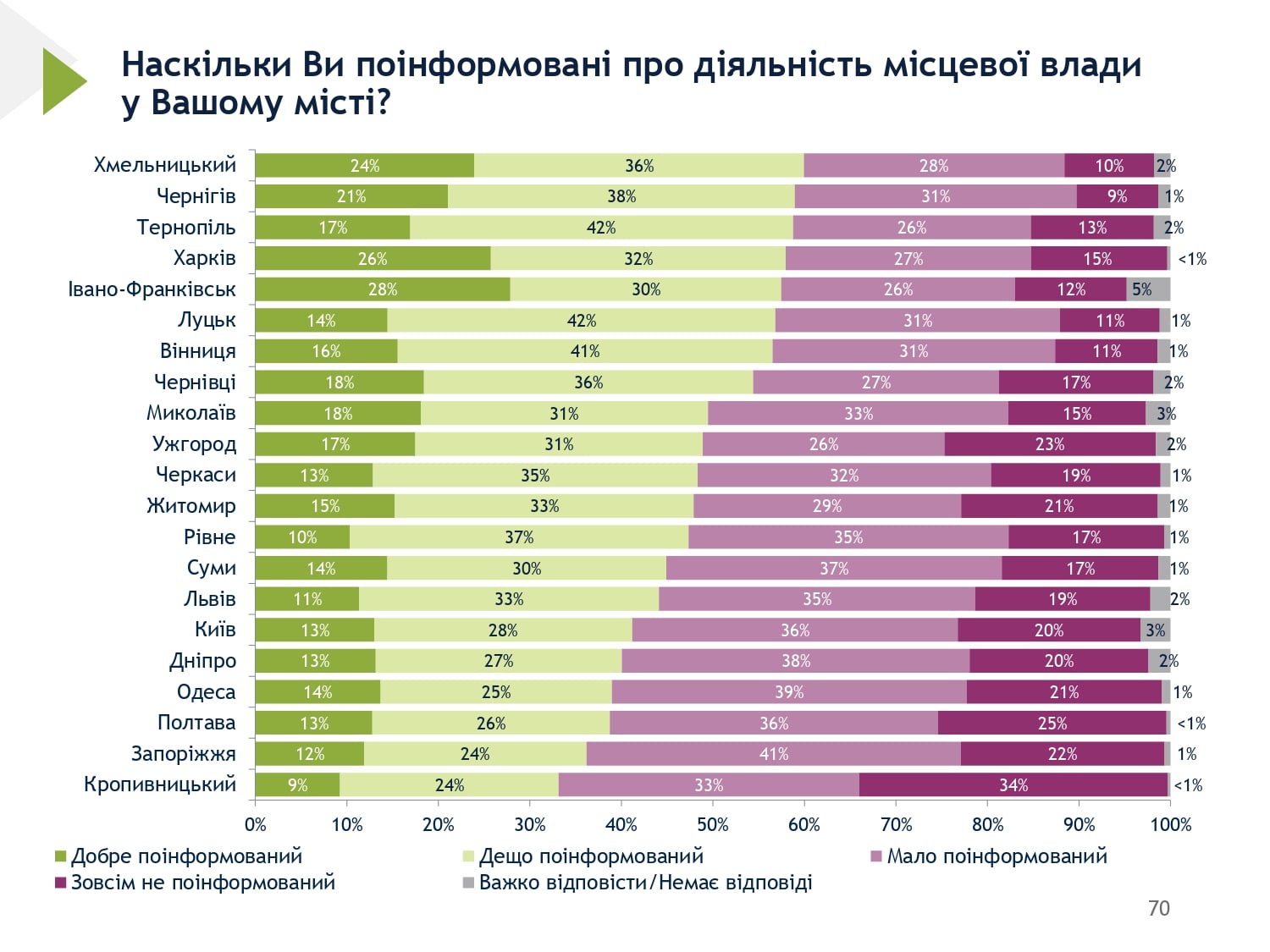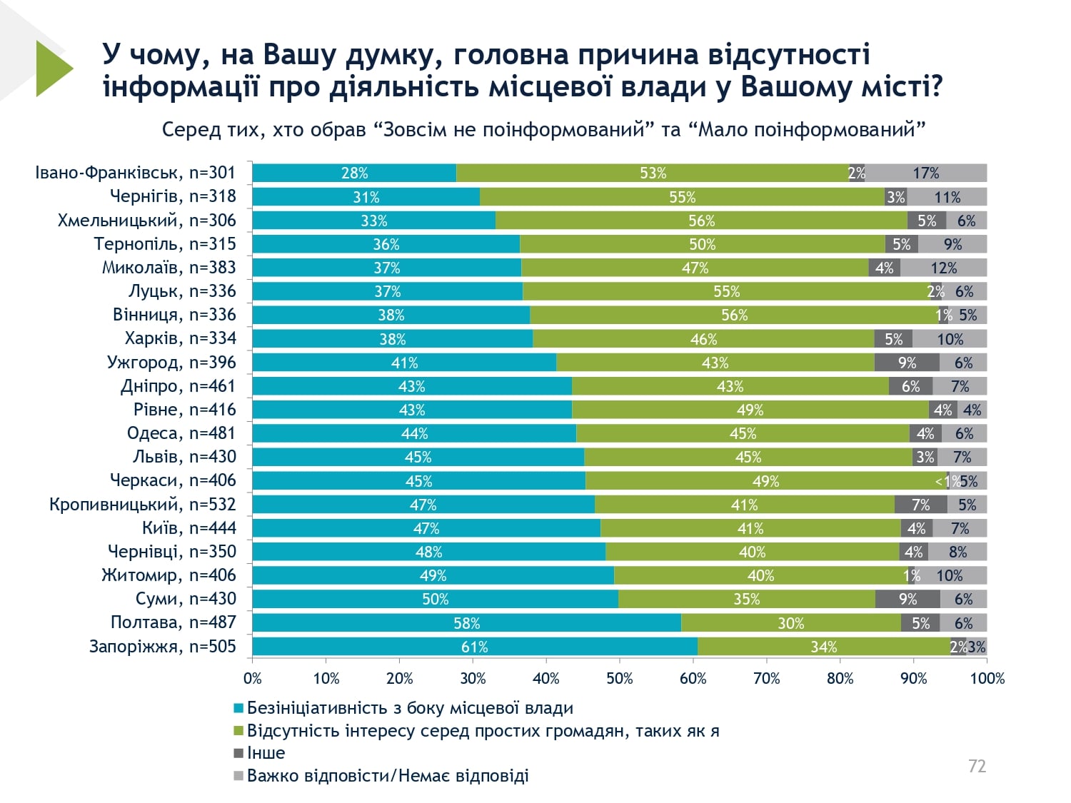 Також Франківськ – найбільш проінформоване місто про діяльність місцевої влади – слайд 70. А серед тих, хто недостатньо проінформований – 53% самі зізналися про відсутність інтересу слайд 72.