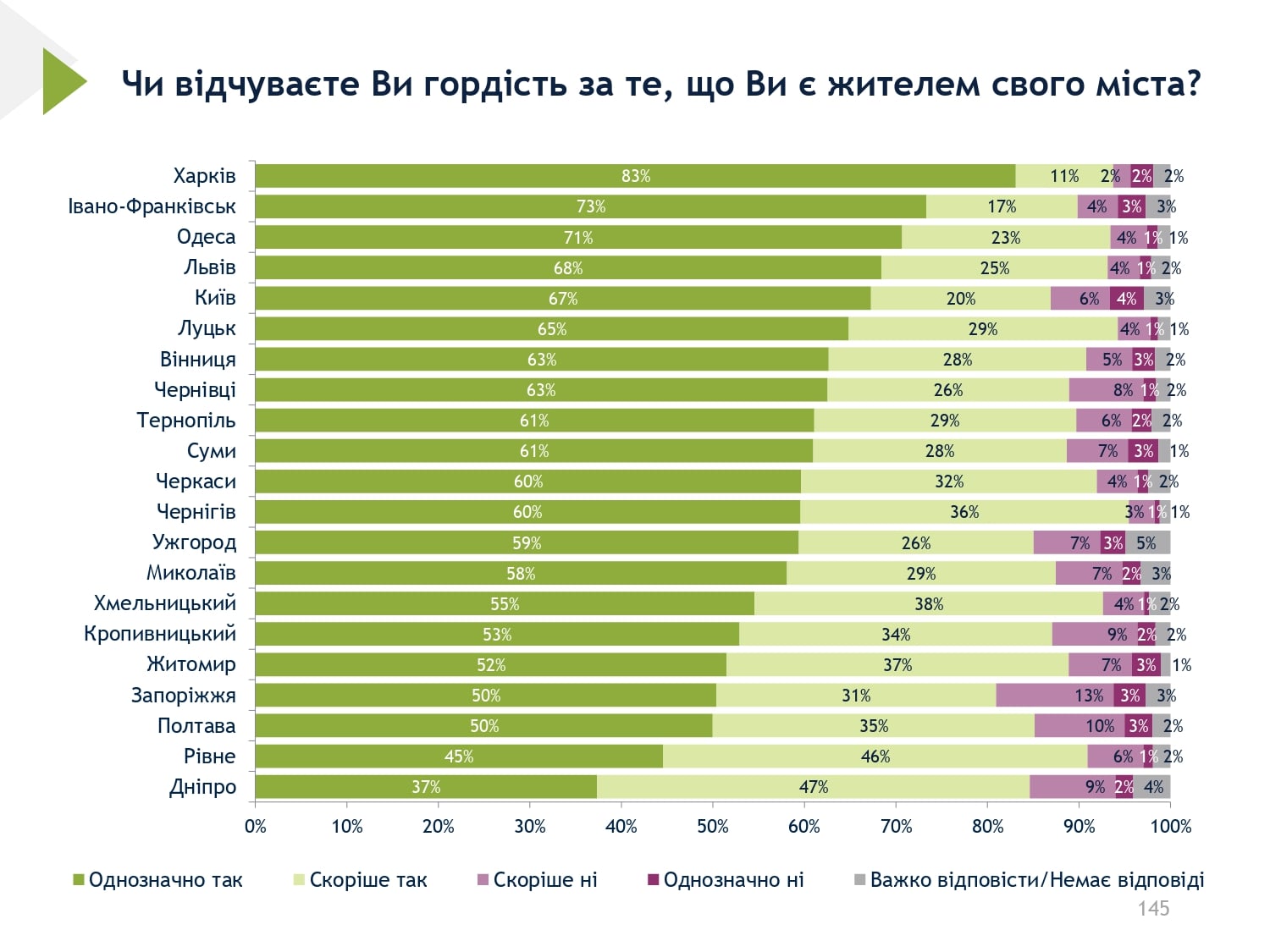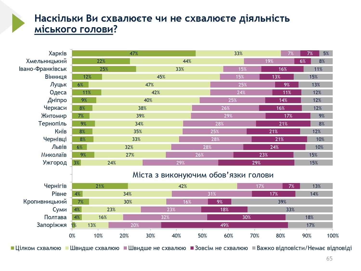 Українці вважають, що у процесі післявоєнної відбудови рішення повинні приймати мери та міські ради. Опитування у всіх містах показало, що громадяни зацікавлені в інформації щодо того, скільки коштів отримала місцева влада на реконструкцію та як вони були використані, зокрема рівень зацікавленості коливається від 76% до 56%.
