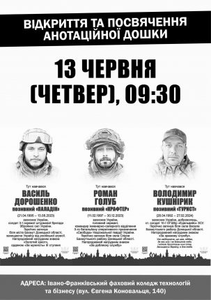 13 червня, на фасаді Івано-Франківського фахового коледжу технологій та бізнесу відкриють анотаційні дошки трьом полеглим Героям.