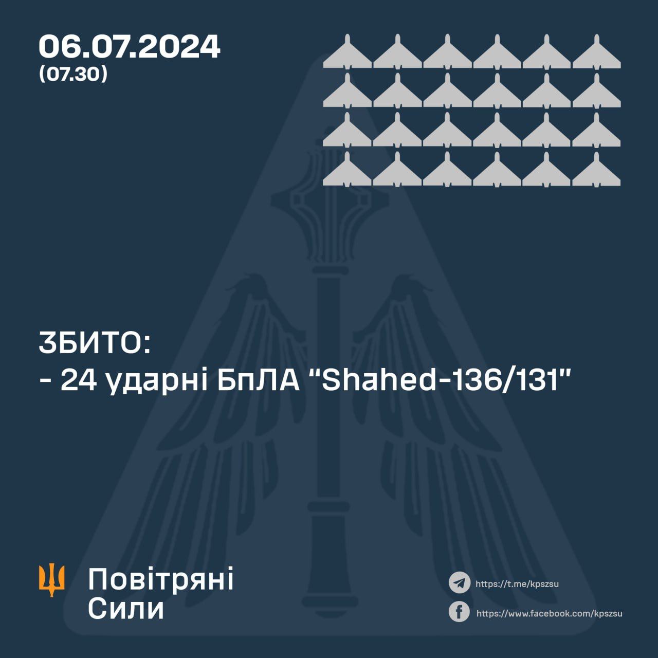 У ніч на 6 липня 2024 року ворог завдав удару 27-ма ударними БпЛА типу Shahed-131/136, з них 24 були збиті. Про це повідомляють Повітряні сили ...