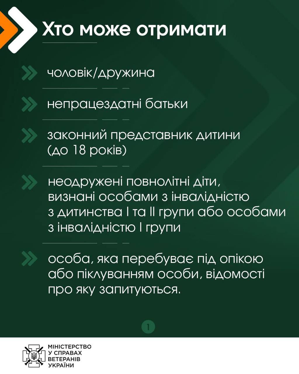 - витяги з реєстрів, що підтверджують статус ветерана війни чи зниклого безвісти.