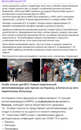 На початку 2025 року російська пропаганда активізувала залякування українців, поширюючи інформацію про нібито новий смертельний вірус — метапневмовірус, який, за їхніми твердженнями, загрожує українським військовим через слабкий імунітет та сирість в окопах. Однак перевірка фактів доводить, що це черговий фейк.