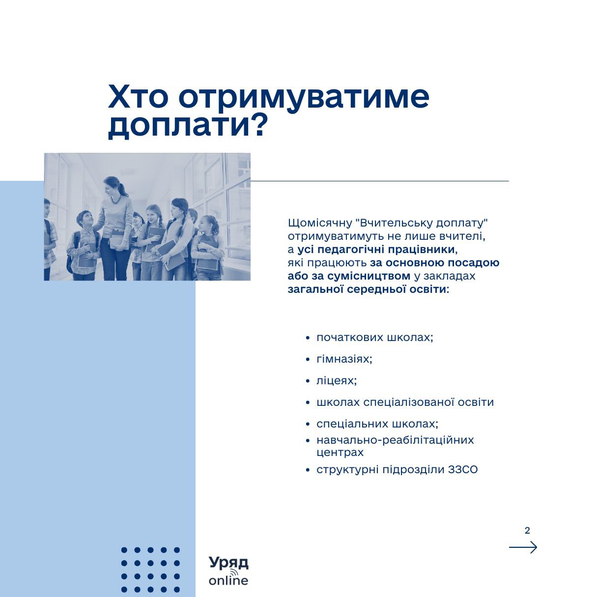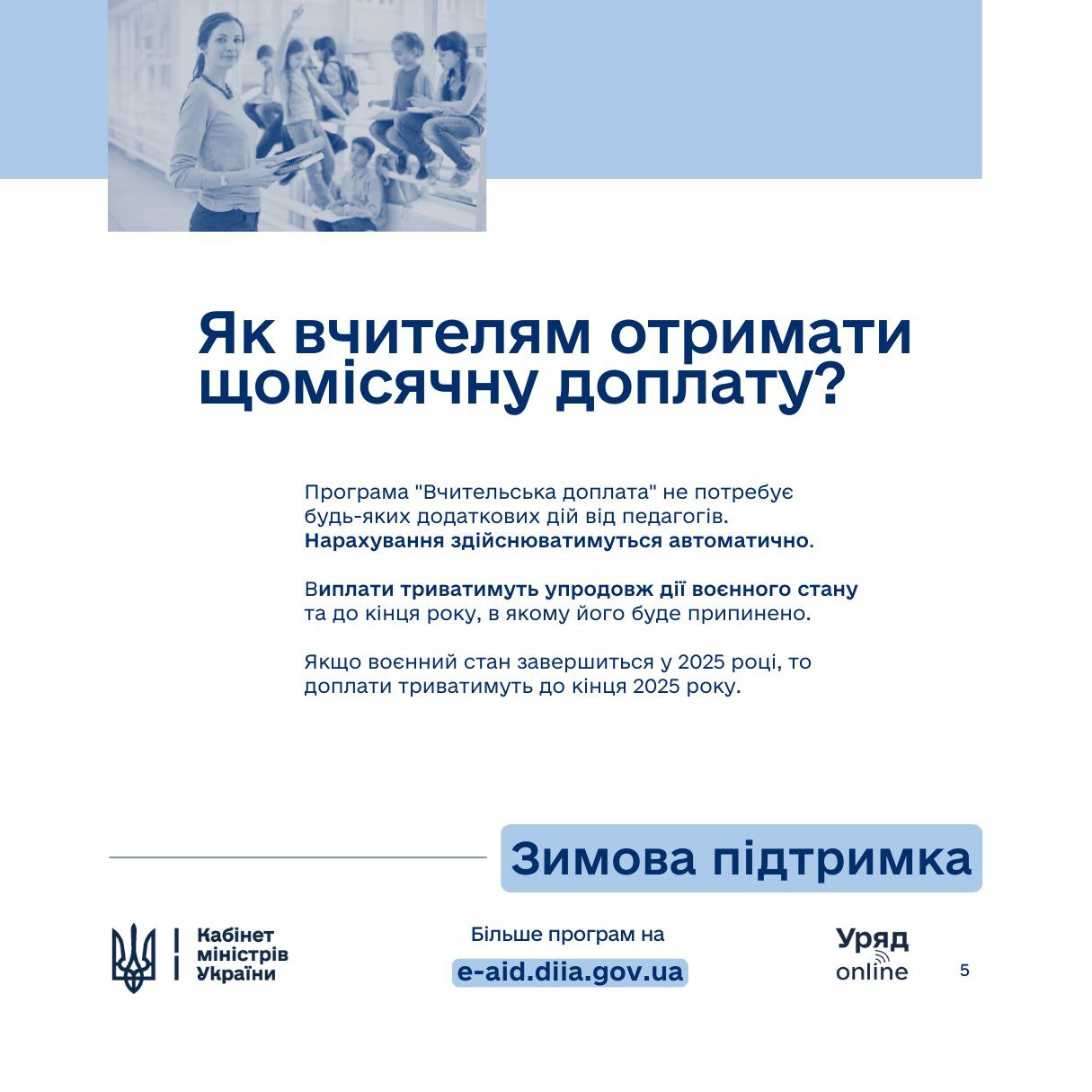 У рамках ініціативи Президента України Володимира Зеленського та Уряду «Зимова підтримка» щомісячну «Вчительську доплату» отримуватимуть усі педагогічні працівники закладів загальної середньої освіти.