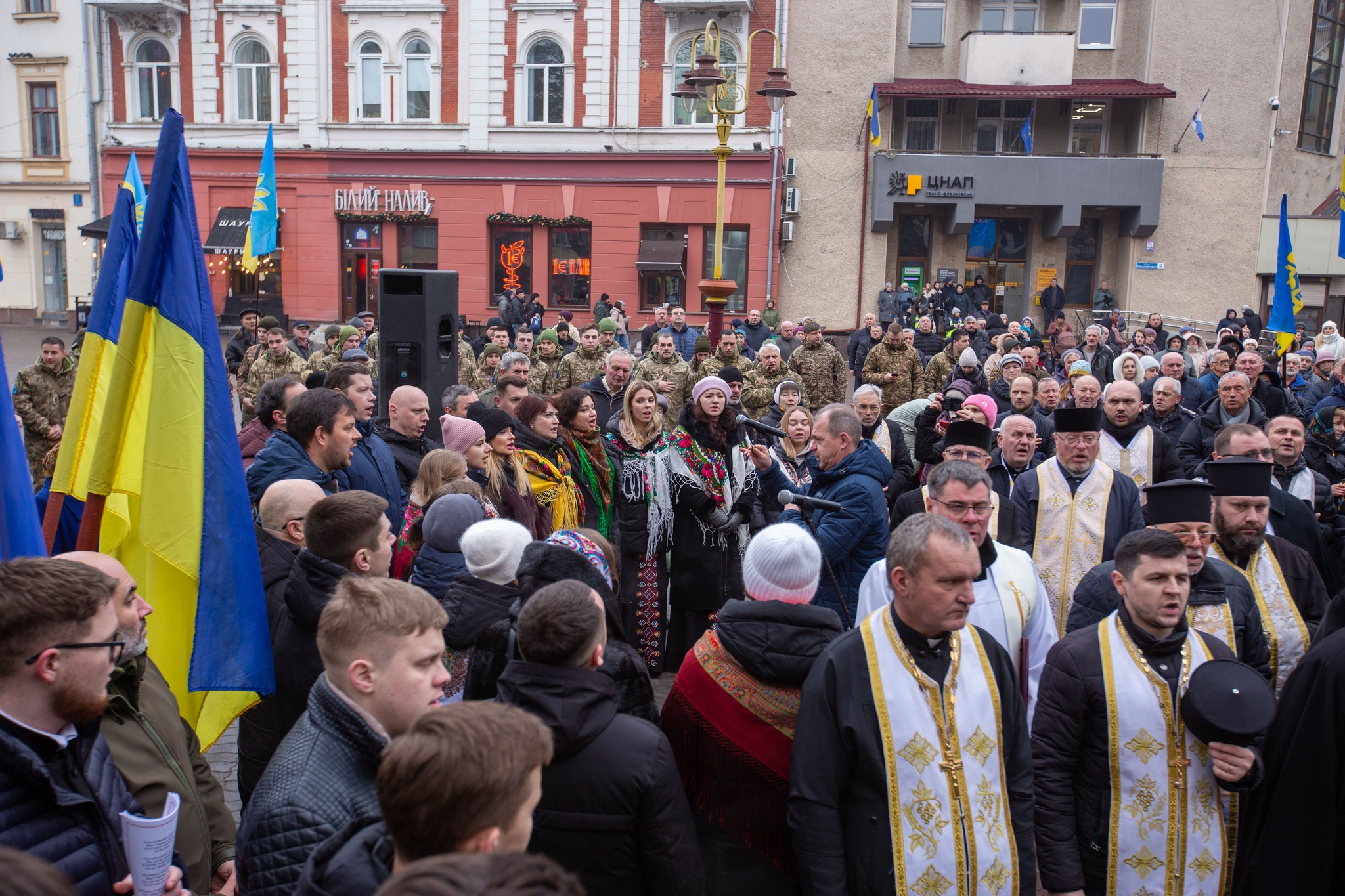 На Вічевому майдані зібралися сотні франківців, щоб вкотре засвідчити: українці єдині й згуртовані, бо прагнуть незалежності та суверенітету. А також, щоб віддати шану тим, хто в цій боротьбі за Україну, віддав найдорожче – своє життя, зазначають у пресслужбі міського голови Руслана Марцінківа.