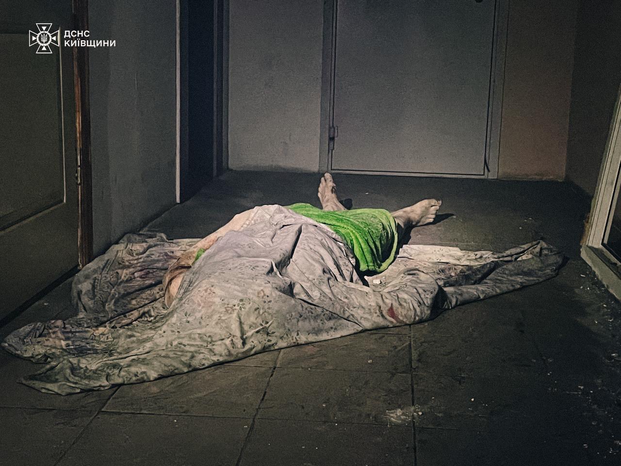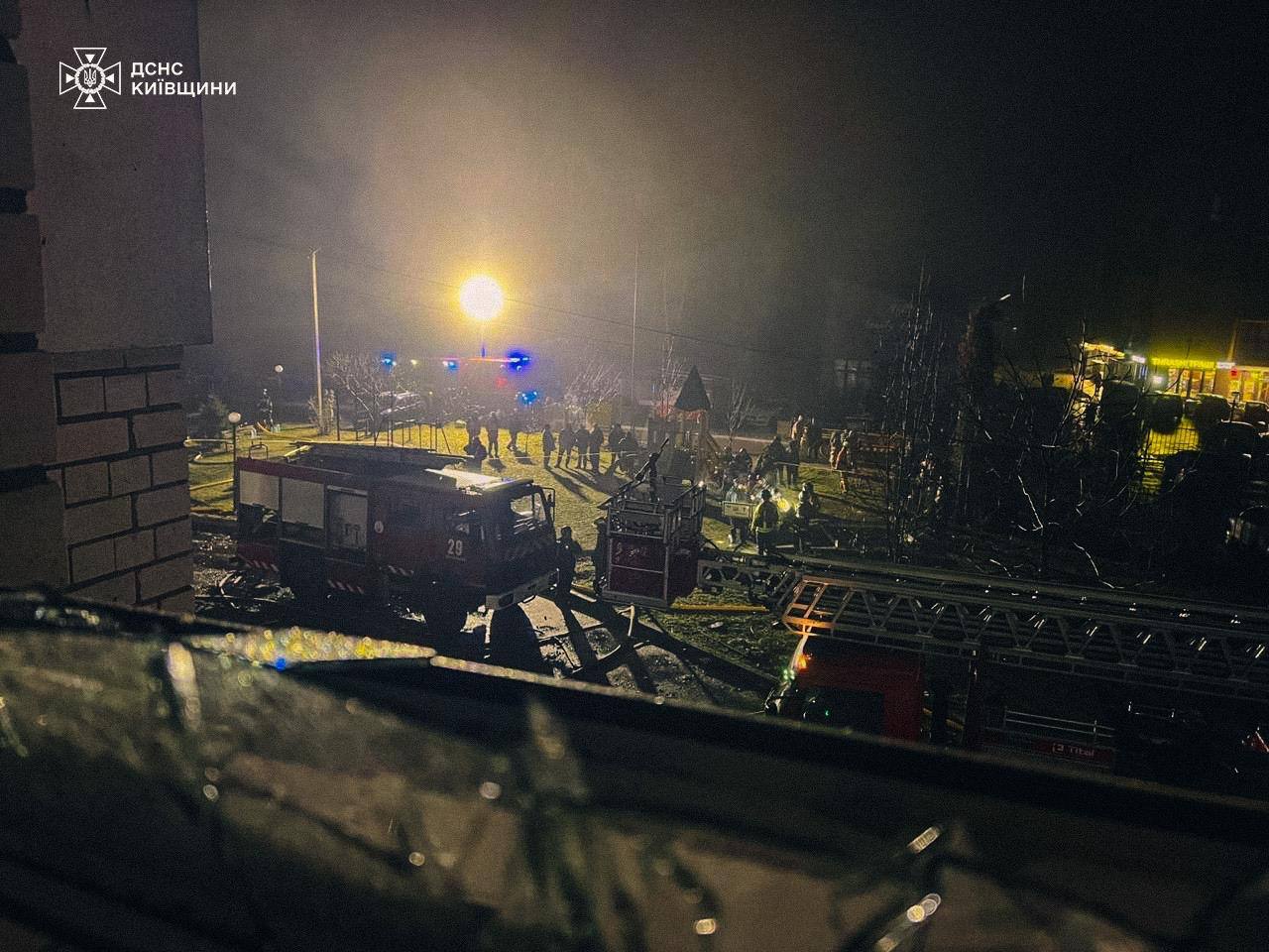 На Фастівщині уламки БПЛА влучили у 10-поверховий житловий будинок, спричинивши пожежу та руйнування на 6-7 поверхах. Евакуйовано 150 мешканців.
