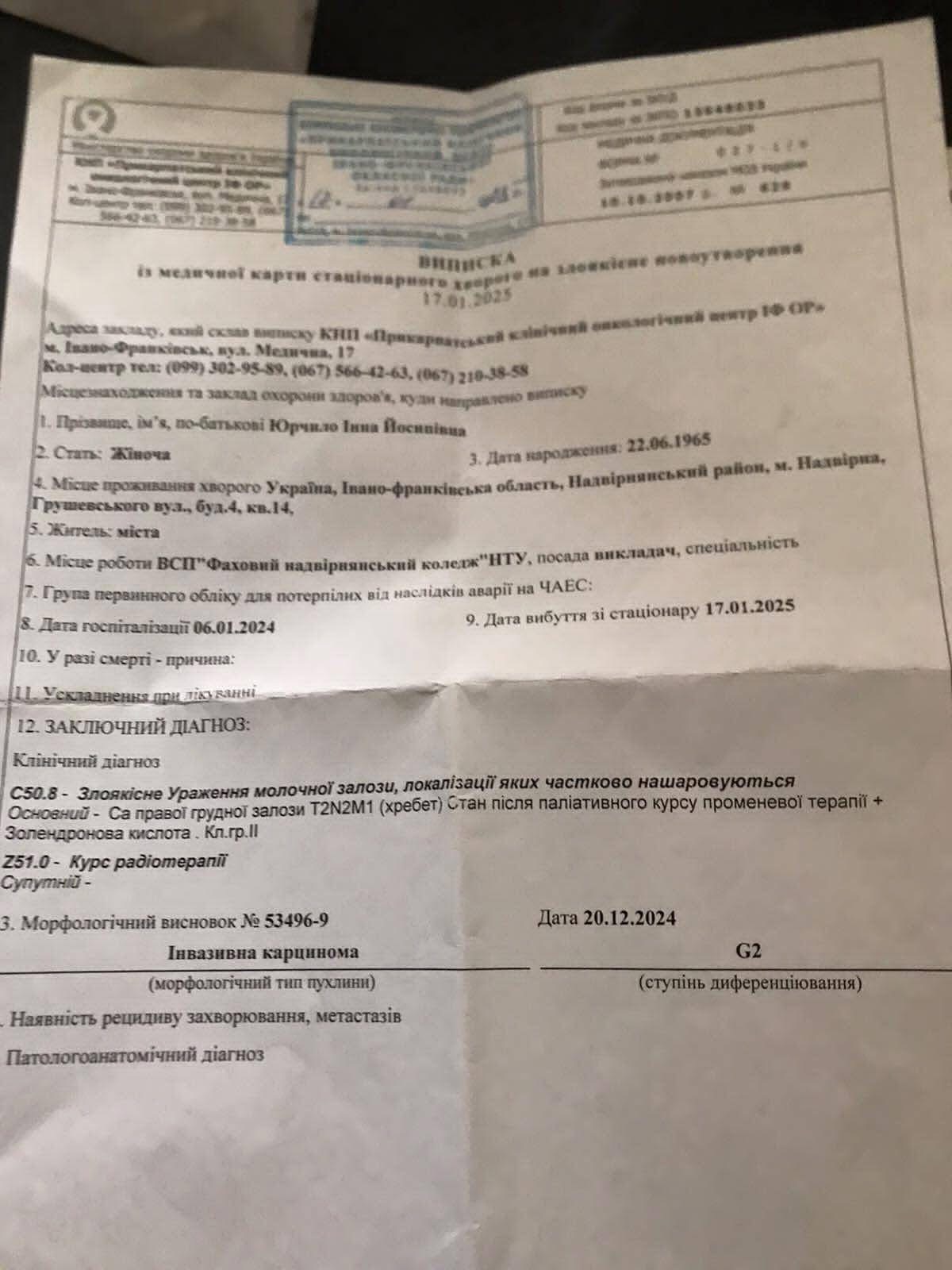 Прикарпатців просять протягнути руку, допомоги і підтримати в лікуванні Інну Йосипівну Юрчило, викладачку ВСП “Надвірнянський фаховий коледж НТУ” (діагноз: інвазивна карцинома).