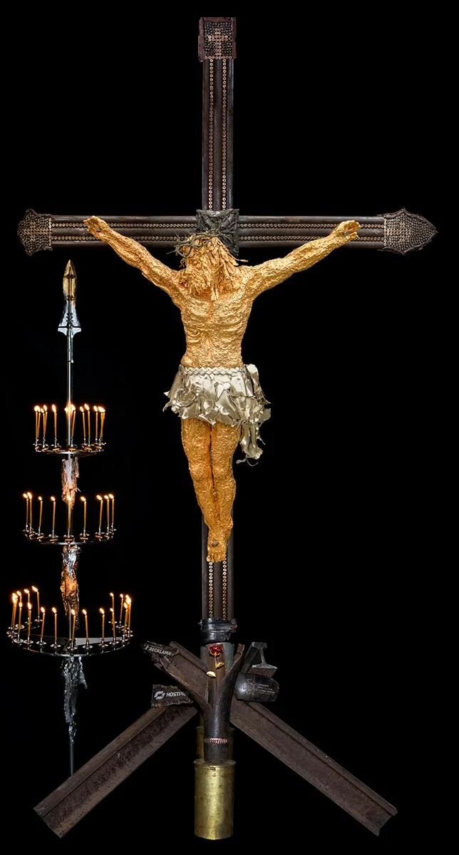 В основі інсталяції – Золоте Розп’яття, скульптура Христа в натуральну величину, виготовлена з 20 000 уламків артилерійських снарядів, зібраних з полів боїв на території нашої Батьківщини. Кожен уламок, недоторканий і незмінний, утворює тіло, спустошене війною.