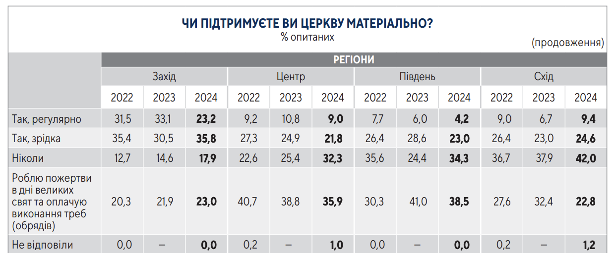 Серед представників різних церков найбільше тих, хто регулярно надає матеріальну підтримку, у вірних УГКЦ — 30%. Вірні ПЦУ демонструють нижчий показник — 13%.