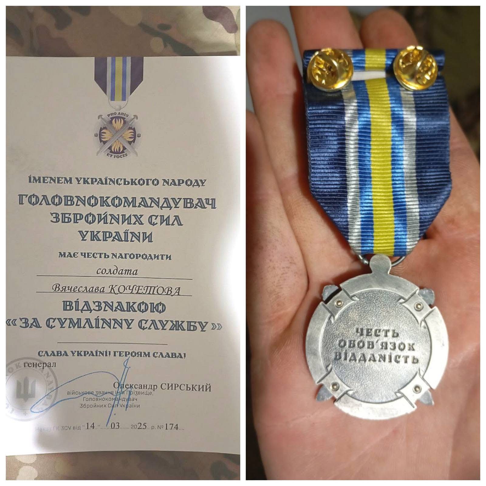 Нещодавно 27-річний солдат Вячеслав Кочетов отримав від головнокомандувача Збройних Сил України відзнаку «За сумлінну службу».