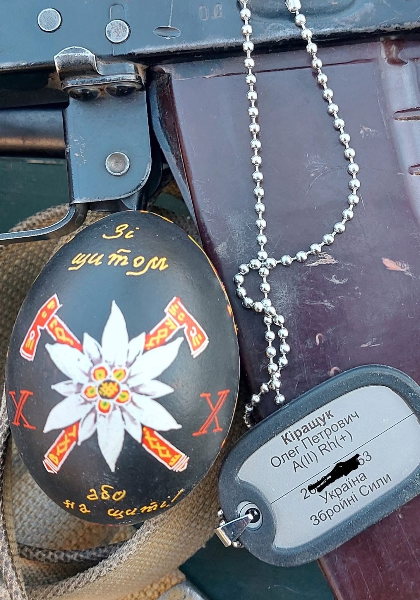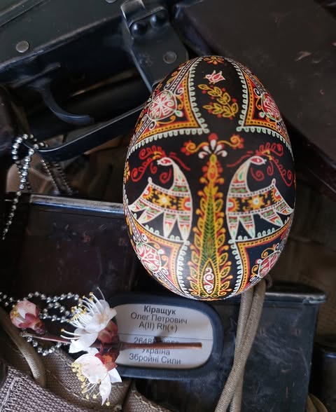«Крайніми часами вдається знайти годину-другу для творчості. Хочеться бути потрібним хоч в такій якості. До речі, хоч зір не молодечий, і в руках відчутно тремор, але… але руки писачок “впізнають”! Побратими поїхали на завдання, а мені легше чекати їх повернення, займаючись творчістю. І ще додам! В наших, українських писанках ніколи не було символіки, яка б бажала комусь лиха. Єдиний символ, який пов’язаний зі зброєю, це – “Наконечники стріл” (найбільша писанка на гусячому яйці). Та і те могло бути проханням до богів, аби полювання було вдалим», – зазначає митець-воїн.