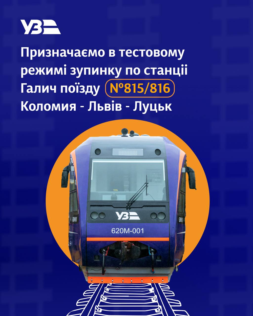 Укрзалізниця в тестовому режимі призначає зупинку по станції Галич для поїзда №815/816 Коломия — Львів — Луцьк.