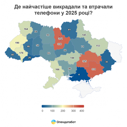 Загалом із січня по березень українці втратили або заявили про викрадення 3 191 мобільного телефону — це майже на 34% менше, ніж за аналогічний період 2024 року. Тенденція до зменшення зберігається вже другий рік поспіль: торік було зафіксовано майже 20 тисяч таких випадків.