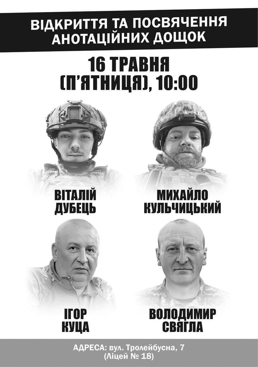У пʼятницю, 16 травня, відкриють анотаційні дошки Героям на фасаді ліцею #18 (м. Івано-Франківськ, вул. Тролейбусна, 7). Саме тут колись навчалися захисники.