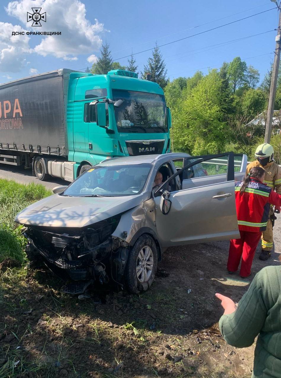 Дорожньо-транспортна пригода сталася 21 травня близько 10:00 у селищі Делятин Надвірнянського району. Внаслідок аварії легковий автомобіль з’їхав у кювет і перекинувся.