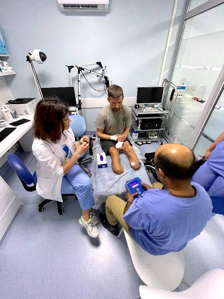 З бійцем працює британський лікар Аарон, який перевіряє рухливість та чутливість. Попереду — складна реабілітація, включно з міостимуляцією для відновлення нервових функцій.