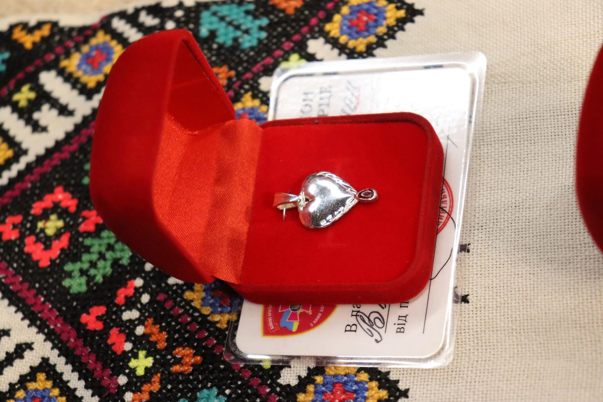 Іменний кулон виготовлений зі срібла у вигляді серця, яке обрамлене терновим вінком з “краплиною крові”. На звороті є прізвище та ім’я загиблого військового.
