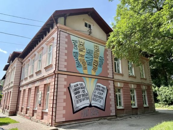 У самому центрі Калуша, на будівлі дитячої музичної школи, встановили банер із цитатами знаного поета, лавреата Національної премії України імені Тараса Шевченка 2025 року, калушанина Юрія Іздрика.