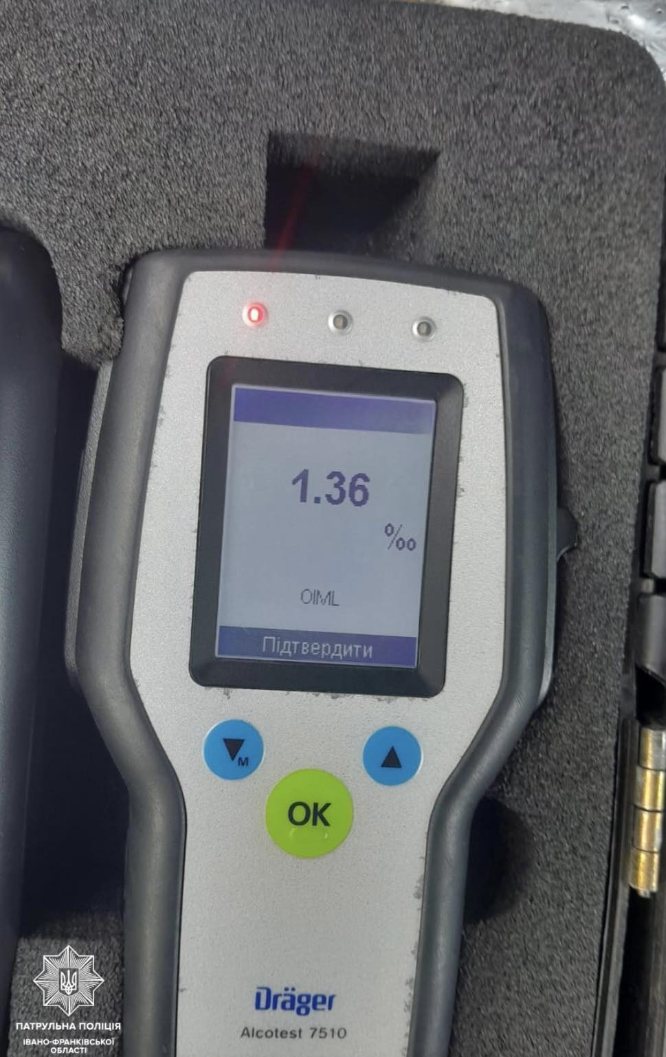 Спілкуючись патрульні виявили у водія ознаки алкогольного спʼяніння. Останній пройшов освідування на місці. Результат — 1.36 проміле алкоголю у організмі.