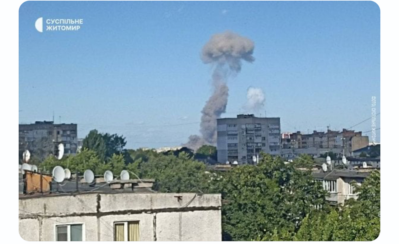 Житомирська ОВА просить жителів Житомира та навколишніх сіл закривати вікна через сильну пожежу внаслідок вибуху.
