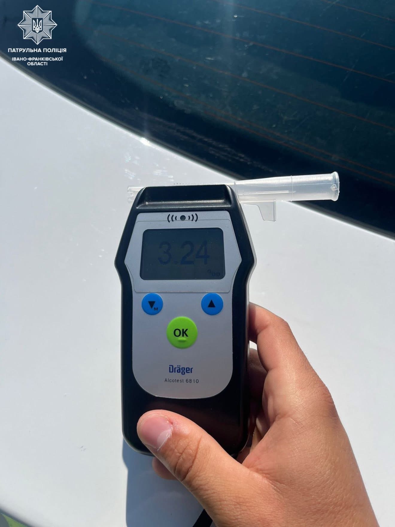 Під час спілкування з водієм Skoda патрульні помітили ознаки алкогольного сп’яніння. Освідування на місці показало 3,24 проміле алкоголю в організмі. Окрім цього, з’ясувалося, що чоловік обмежений у праві керування транспортними засобами.