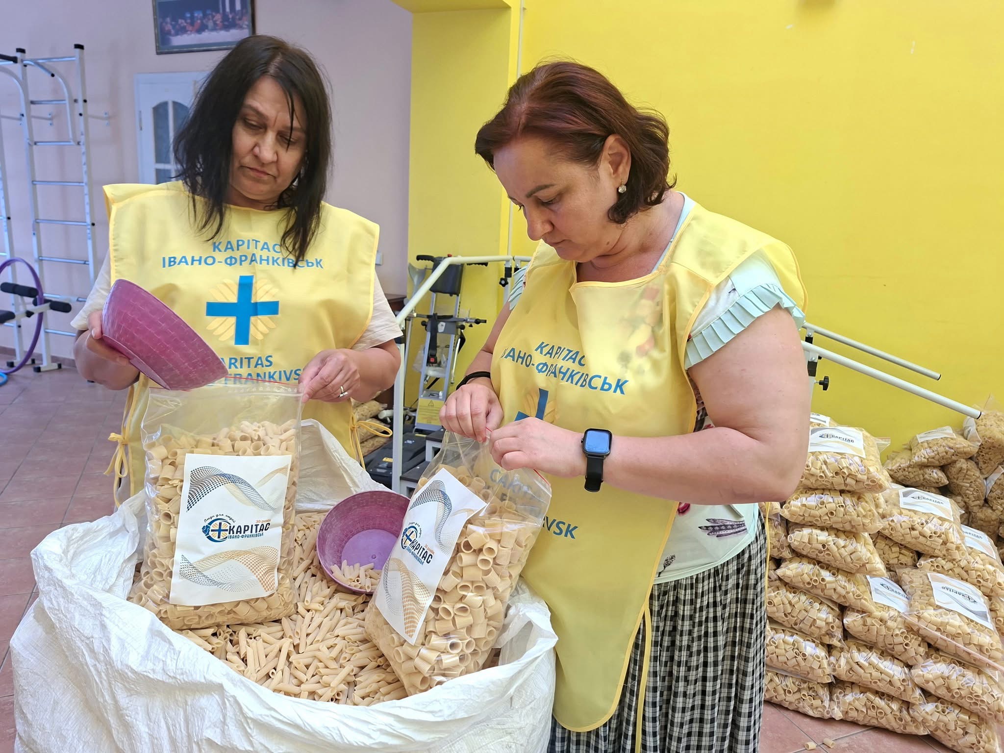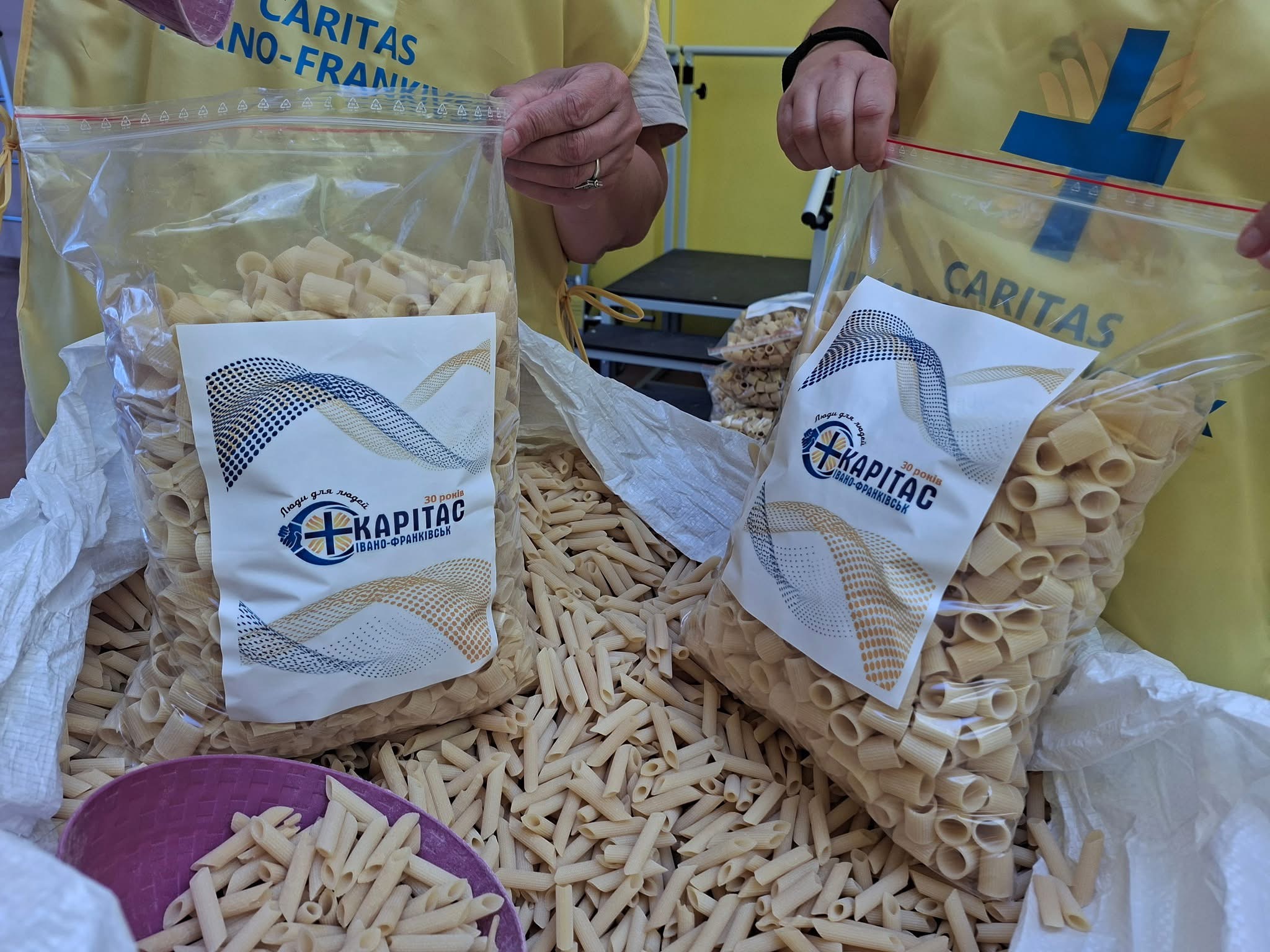 Працівники Карітасу разом з волонтерам фасують макарони і вже невдовзі роздадуть їх потребуючим сім’ям.