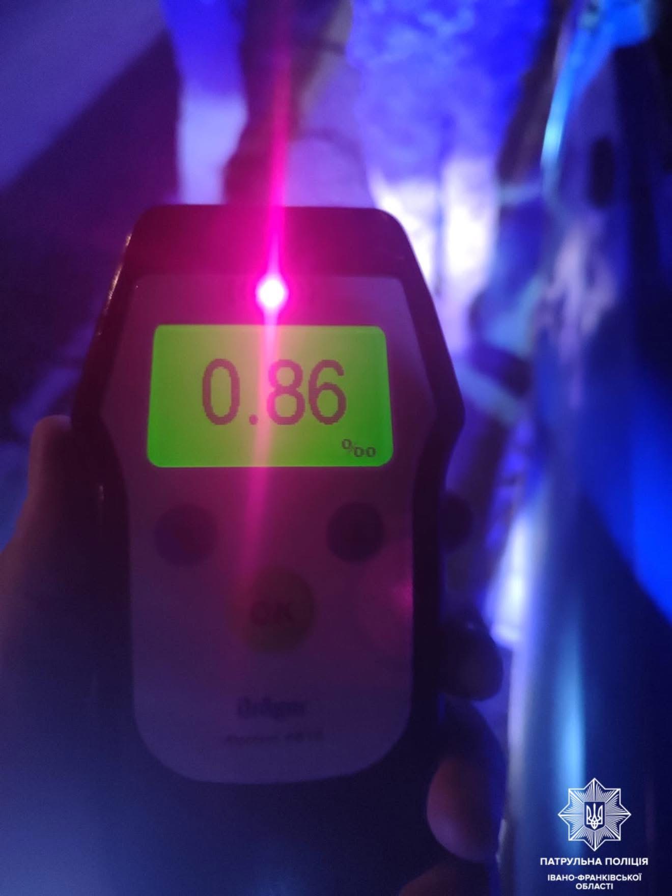Під час спілкування з 39-річним водієм, поліцейські помітили в останнього ознаки сп’яніння. Водій пройшов освідування на місці. Результат — 0.86 проміле алкоголю.