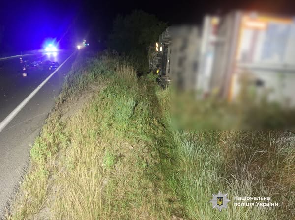 Помітивши людину, водій застосував екстрене гальмування та вивернув кермо праворуч, у результаті чого транспортний засіб перекинувся.