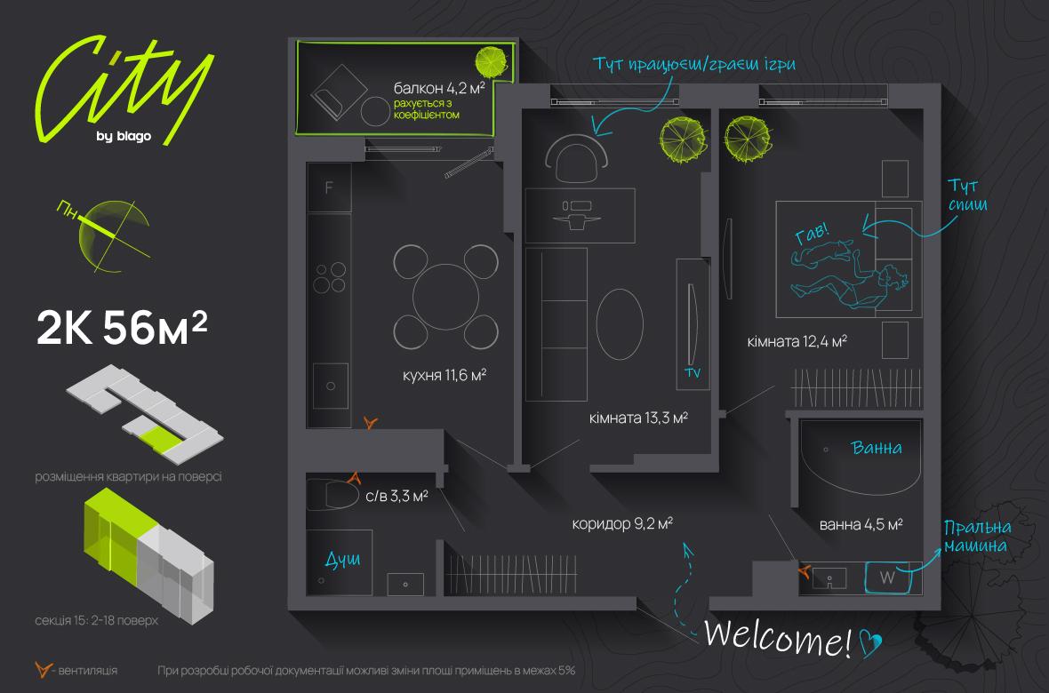 «City» – новий район забудовник назвав не просто так, адже має амбітну мету – створити повноцінний міський простір, де все необхідне буде на відстані кількох кроків. Цей проєкт реалізується в прогресивному форматі live-work-play, тобто «живи, працюй, відпочивай» в одному просторі. Новий район – не лише житло, а й коворкінги, бізнес-центри, торговий центр та магазини, офіси, школа та садочок. А для досягнення work-life балансу – спортивна інфраструктура, кав’ярні та чисельні локації для відпочинку просто неба.