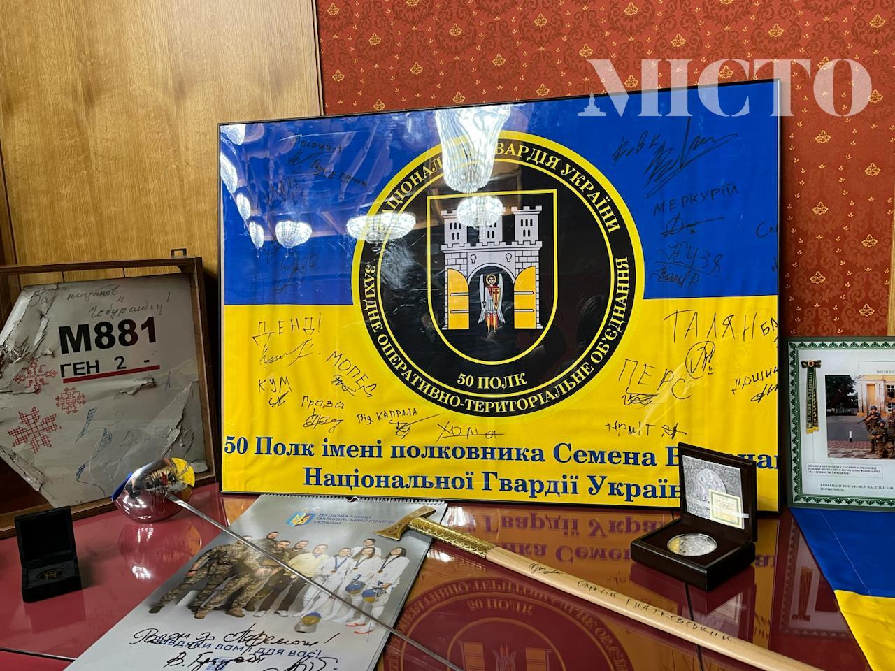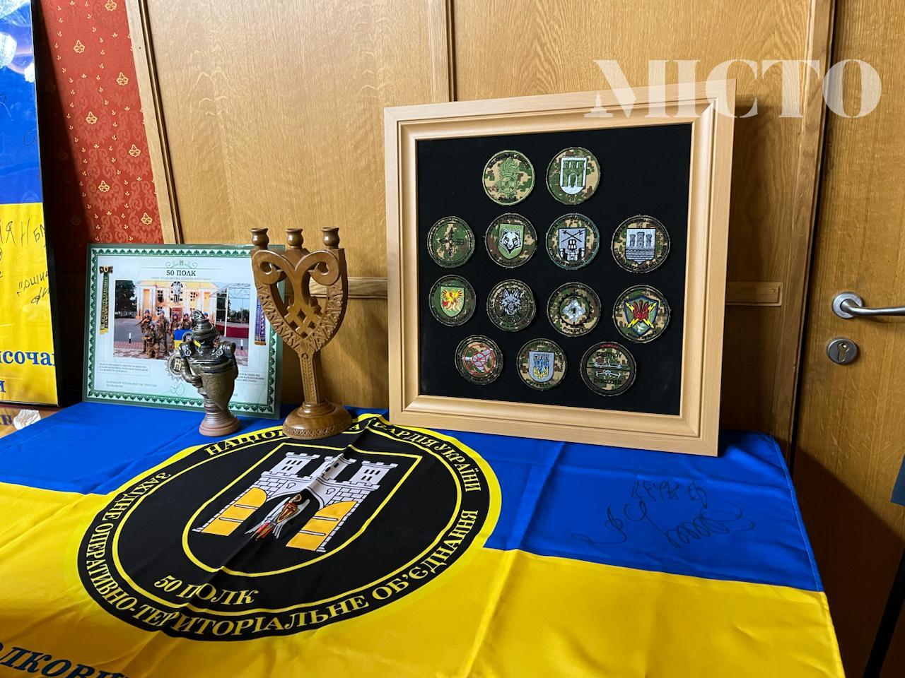 прапори з автографами бійців 50-го полку, які зараз виконують бойові завдання;