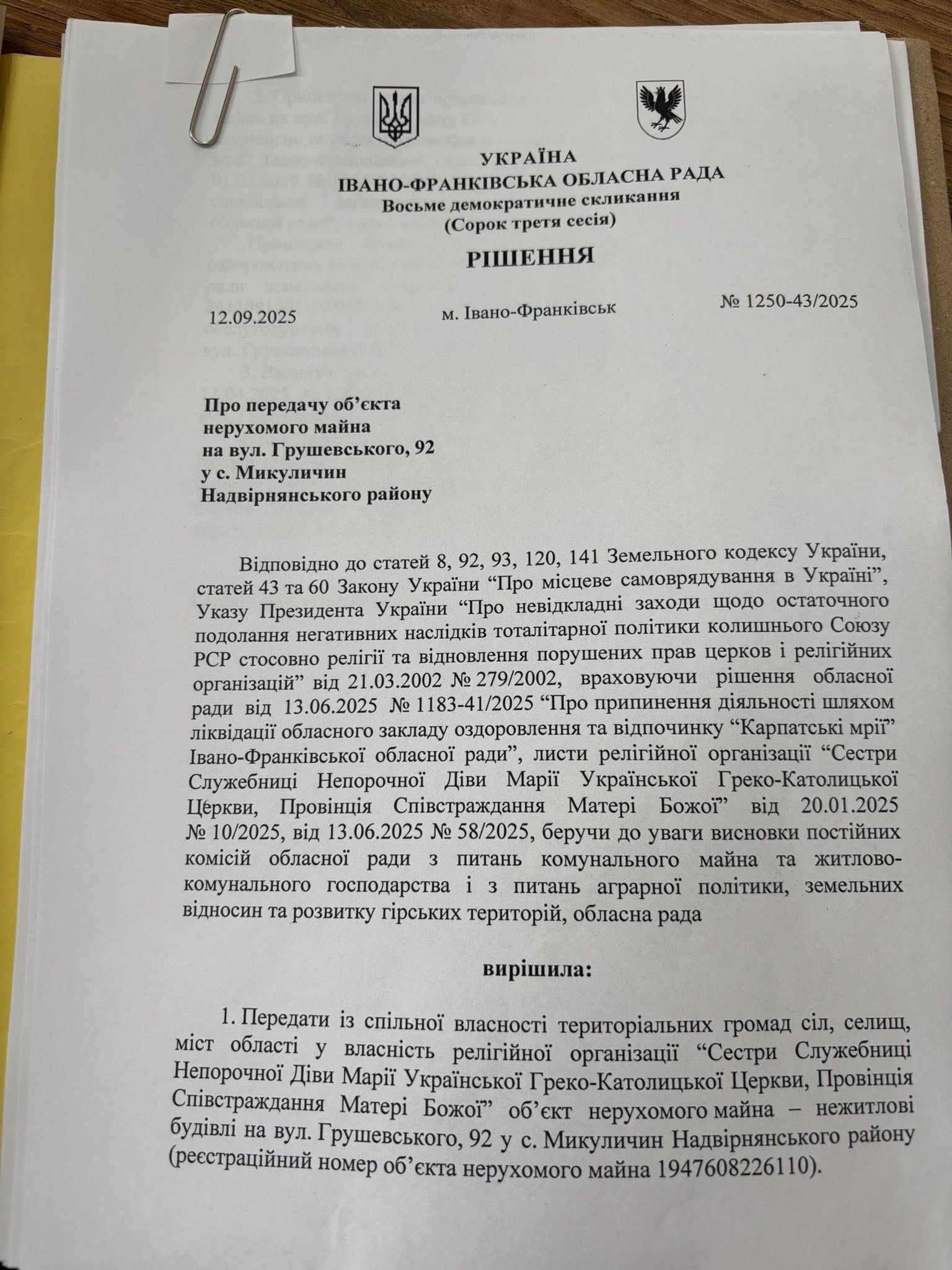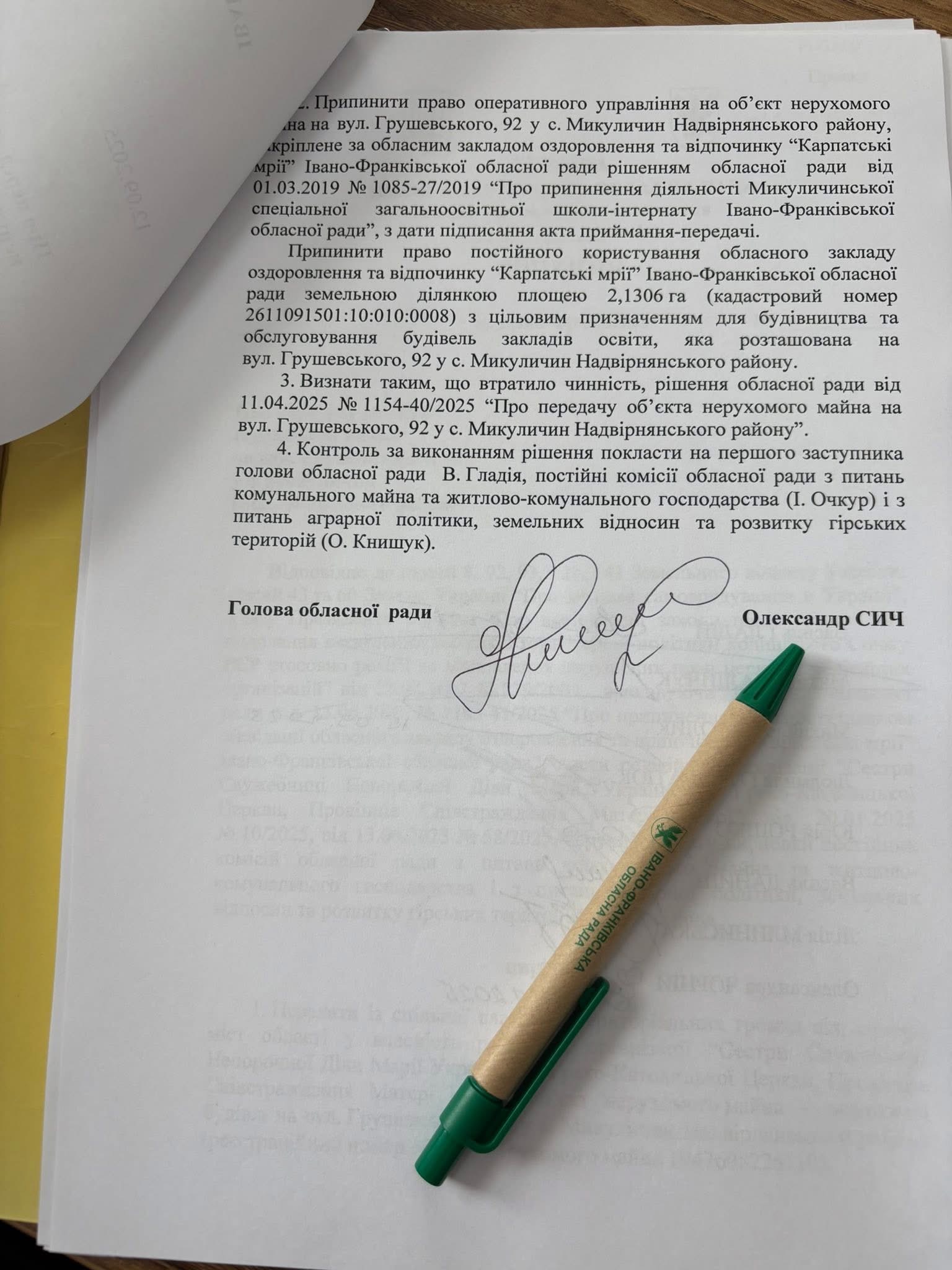 Голова Івано-Франківської обласної ради підписав рішення Івано-Франківської обласної ради про передачу Сестрам Служебницям Непорочної Діви Марії УГКЦ історично належного їм майнового комплексу у селі Микуличин.