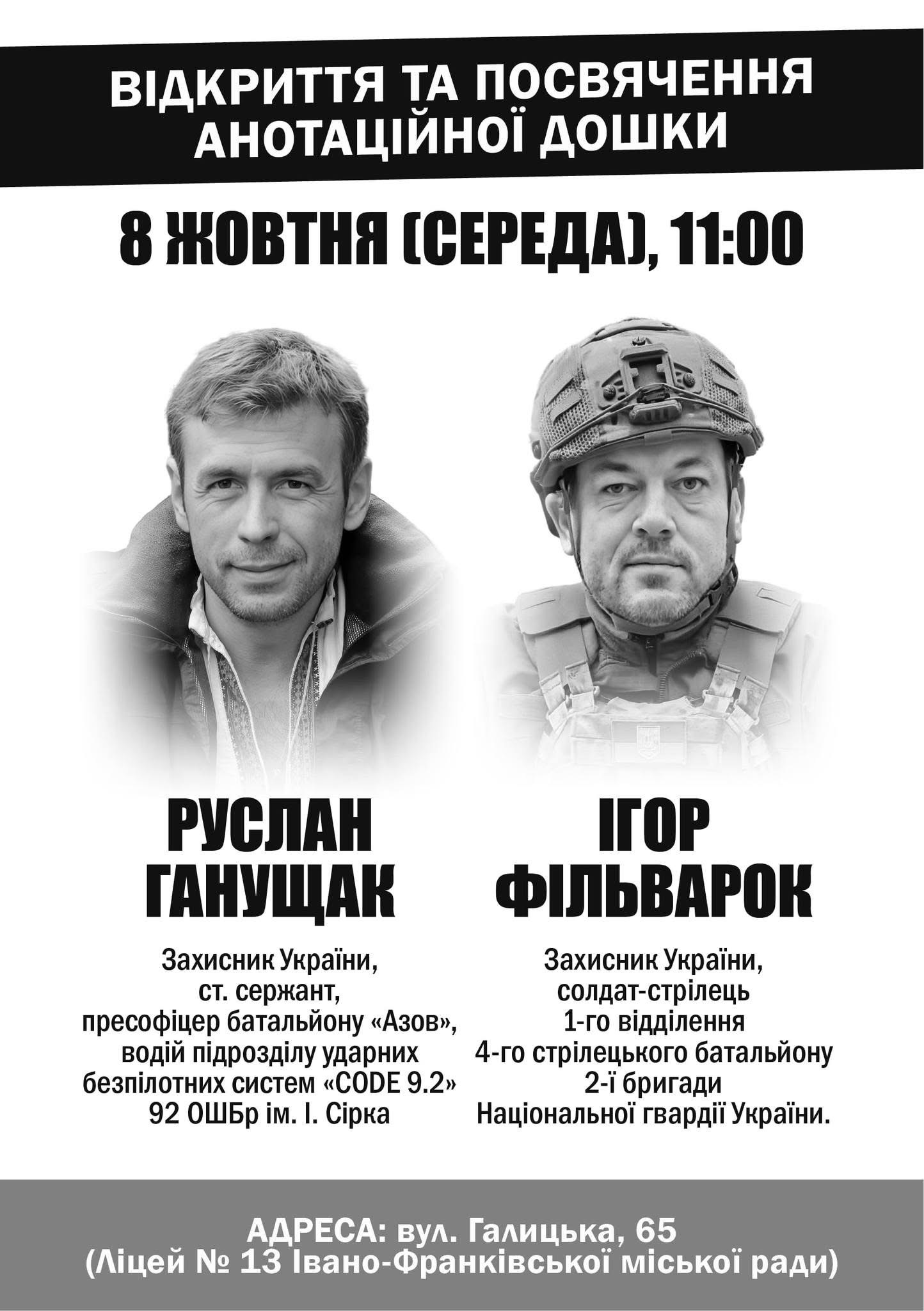 Уже цієї середи, 8 жовтня, на фасаді Ліцею № 13 з`являться пам’ятні дошки загиблим українським Героям – Руслану Ганущаку та Ігорю Фільварку.
