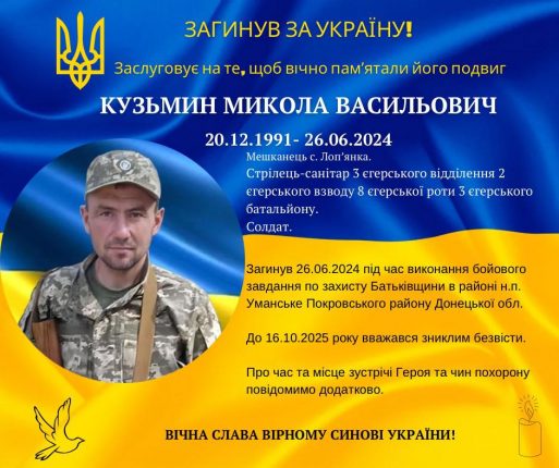 Гірка звістка знову прийшла на Долинщину — підтвердилася загибель Миколи Кузьмина, мешканця села Лоп’янка, який віддав життя, виконуючи бойове завдання на Донеччині.