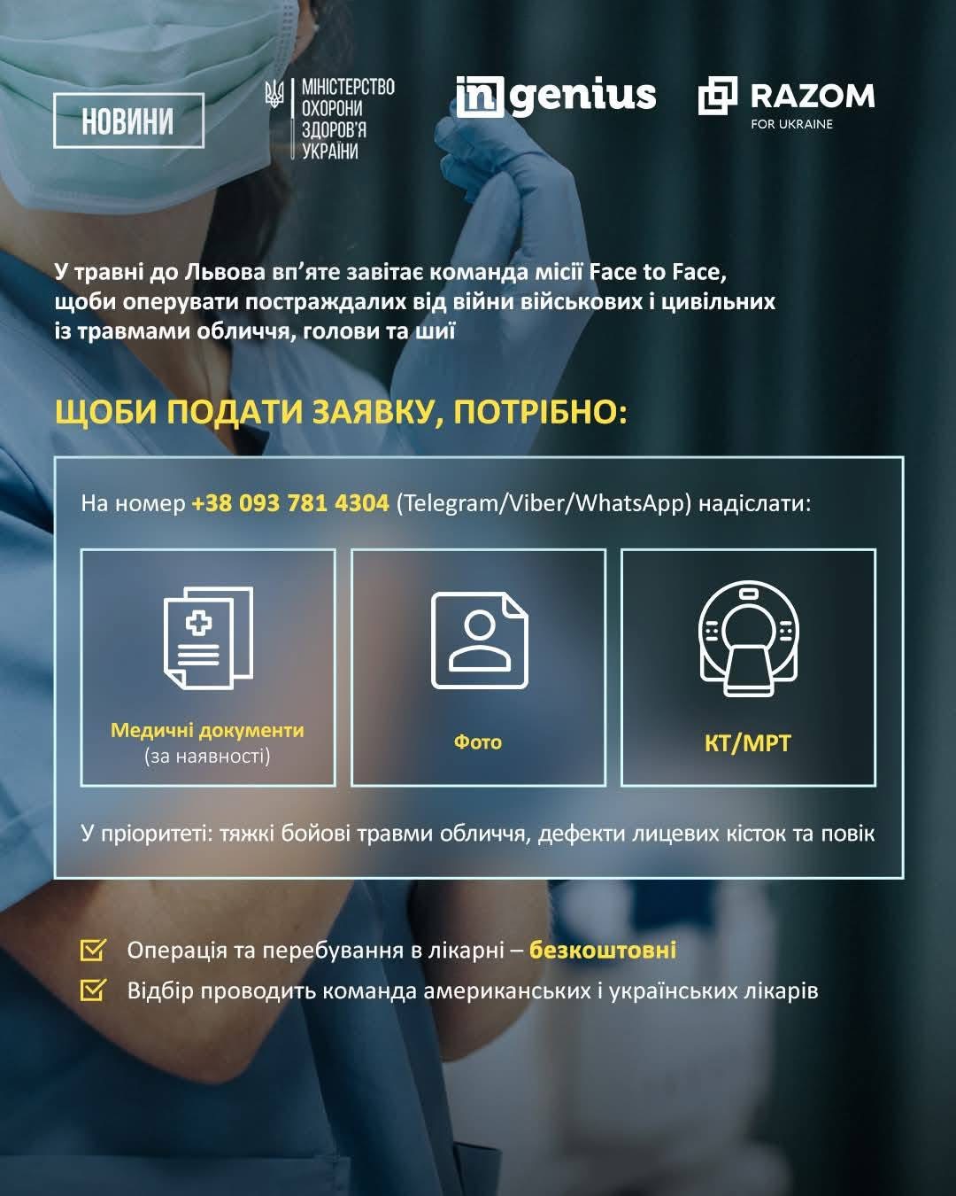 Це вже шоста місія Face To Face. Вона здійснюється у співпраці American Academy of Facial Plastic and Reconstructive Surgery (AAFPRS) із Razom for Ukraine, INgenius та Healing The Children, Northeast. Завдяки попереднім п’ятьом допомогу отримали 140 українців.