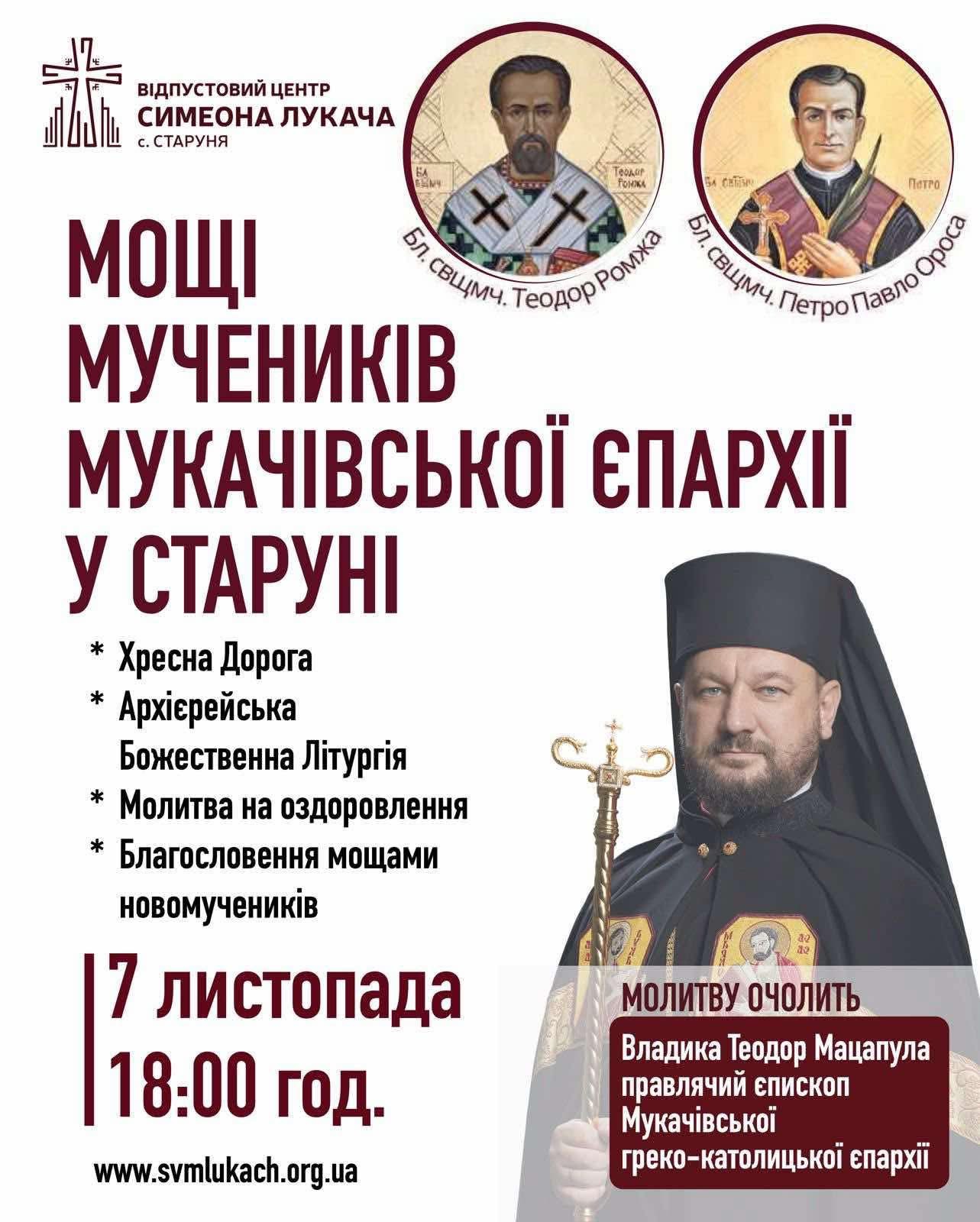 У п’ятницю, 7 листопада, до Відпустового центру блаженного священномученика Симеона Лукача у Старуні вперше завітає Преосвященний владика Теодор Мацапула – правлячий єпископ Мукачівської греко-католицької єпархії. З благословення Архієпископа і Митрополита Івано-Франківського Володимира Війтишина, владика Теодор очолить богослужіння та привезе мощі мучеників Мукачівської єпархії – блаженного священномученика Теодора Ромжі та новопроголошеного блаженного священномученика Петра Павла Ороса.