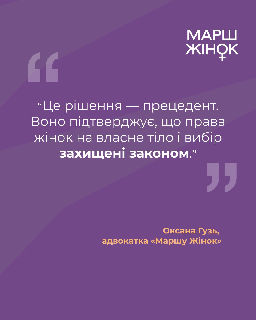 У «Марші Жінок» наголошують, що це рішення має прецедентне значення і захищає право жінок на самовизначення та доступ до безпечної медичної допомоги.