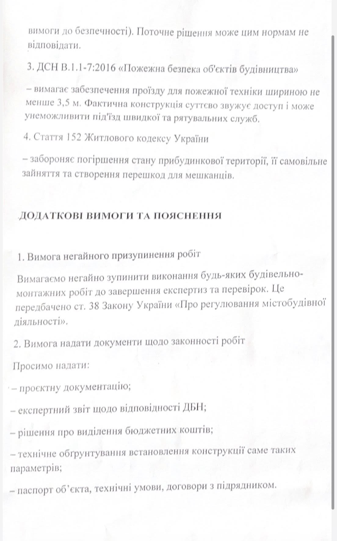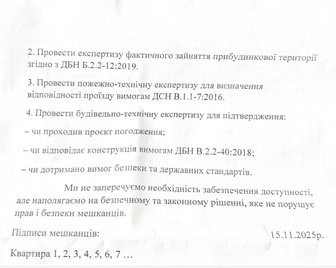 Під час зустрічі з сім’єю та мешканцями, які протестують, люди заявили, що нібито не проти пандуса, але вважають його «задовгим», «загроміздким» та «некрасивим». Пропонували зробити його коротшим або встановити електричний підйомник. Проте такі вимоги суперечать законодавству та техніці безпеки. Як зазначають у міськраді, ухил пандуса не може бути крутішим за норму — у цьому випадку проєкт уже виконано в максимально компактному варіанті, дозволеному ДБН.